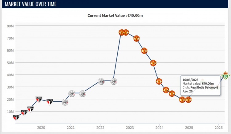 本赛季至今,26岁的安东尼在各项赛事出战34场比赛,贡献11球9助攻,目前他是皇家贝蒂斯队内身价最高的球员。